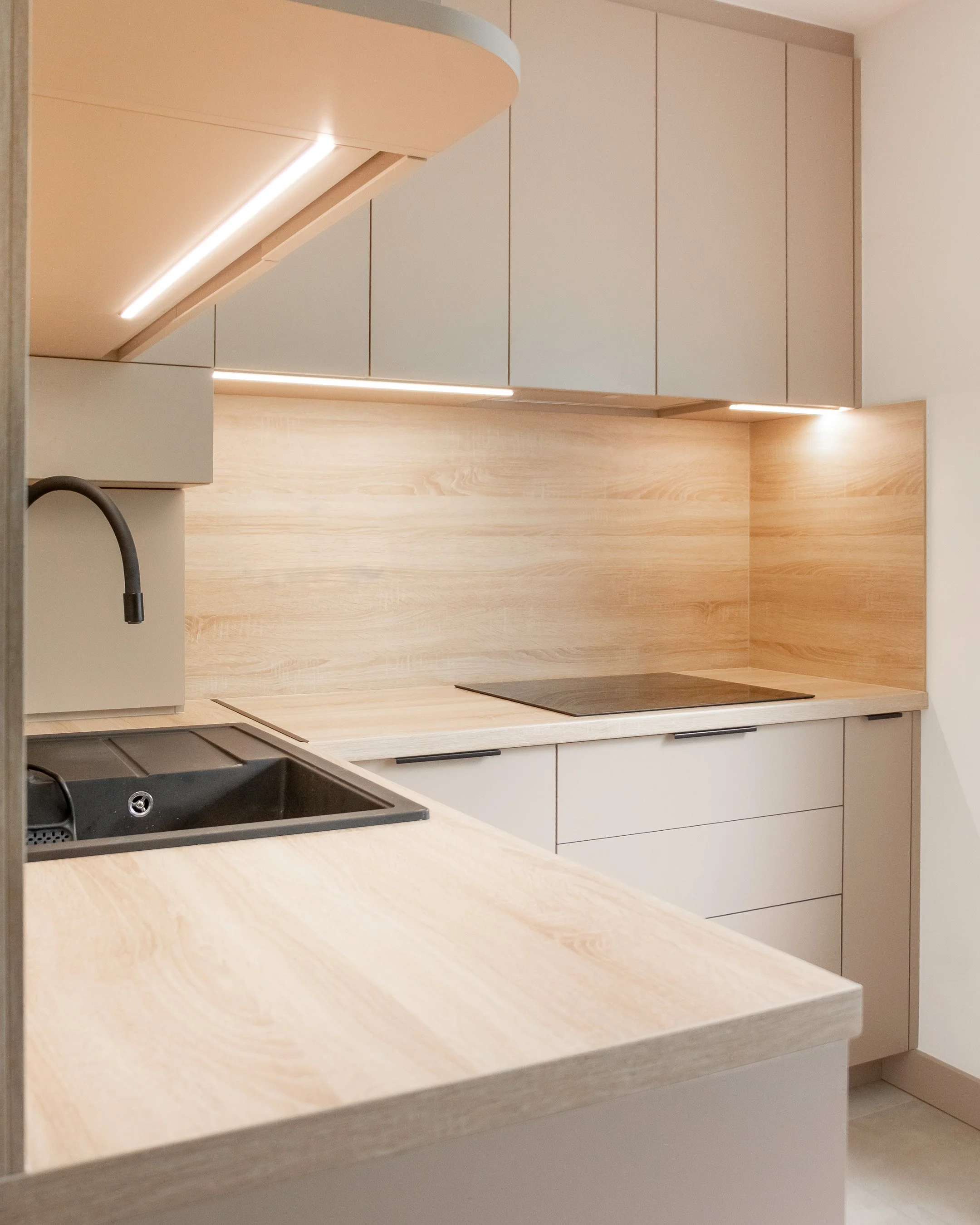 Ova kuhinja spoj je jednostavnosti i funkcionalnosti. Kroz kombinaciju mat bež fronti i dekora drveta stvoren je prostor koji izgleda moderno, ali istovremeno ugodno i prirodno. Sve linije su čiste i ravne, bez suvišnih detalja, što prostoru daje elegantan i smiren karakter. Radne površine i zidni panel u istom drvenom tonu unose dozu topline i teksture, dok ugrađena rasvjeta ispod elemenata naglašava prirodnu boju materijala. Otvorene police u kutu razbijaju ravne plohe i dodaju malo dinamike i osobnosti prostoru. Kuhinja je izrađena po mjeri, s fokusom na praktičnost i maksimalno iskorištavanje svakog centimetra. Rezultat je kompaktan, skladan prostor koji izgleda jednostavno, ali skriva puno pametnih rješenja za svakodnevno korištenje.